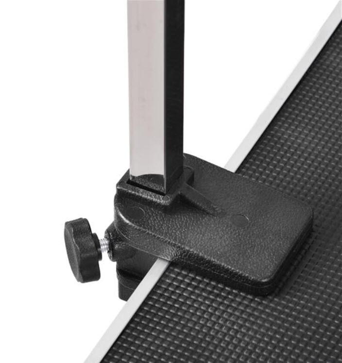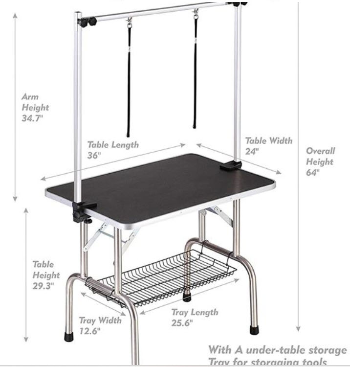Solid construction and sturdy table. stainless steel legs and arms, aluminum edges for the MDF board. The table board is ribbed rubber surfaced which ensures the pets' safety. Static-free board with skid resistance makes it easy to clean. Comes with a clamp-on Adjustable Grooming Arm and security nylon Loop to Fix the dog for grooming.  Adjustable Arm: the height of the arm adjustable to fit different dogs' needs. The feet are covered by rubber caps to protect the floor. Specifications Storage Basket: a basket attached to provide storage for the grooming tools.