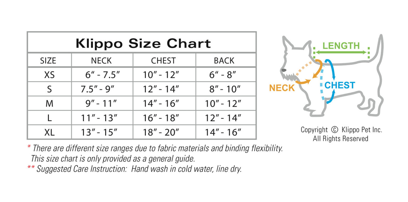Sporty raincoat/bodysuit with safety reflective stripes, comes with a matching zippered pouch for easy storage. A large D-ring on the back for easy leash attachment, and an adjustable elastic band for a snugly fitting. Velcro closure. A small D-Ring attached above the top snap button closure to add on a "Klippo" charm or ID tag! Each outfit comes with a "Klippo" metal charm. (Size XS fits: Neck 6"~7.5"; Chest 10"~12"; Back Length 6"~8")