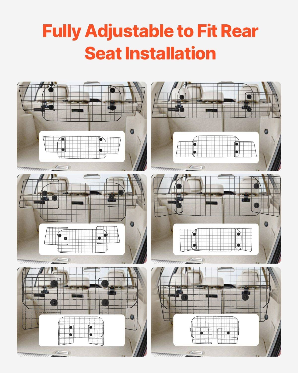 2.Versatile Configurations: Our vehicle pet barrier can be customized to fit different vehicle models with up to 6 adjustable shape combinations. This ensures broader coverage, making it harder for small dogs to climb through.