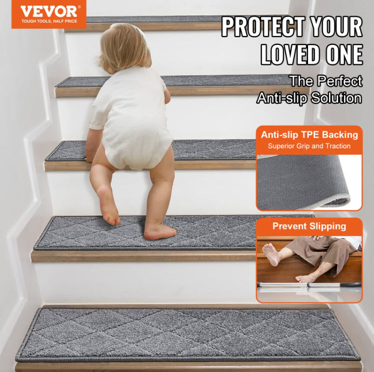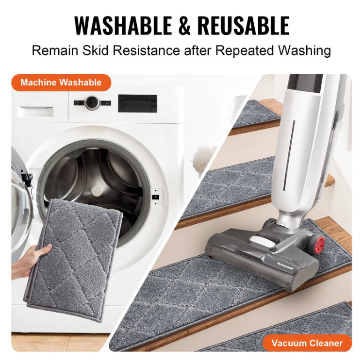 2. Washable & Reusable: Our non-slip stairs carpets are easy to clean. You can use a vacuum to remove dust, scraps, and pet hair. They can also be tossed into the washing machine, and they will maintain their shape and slip resistance even after repeated washings. Plus, our edge-locking technology prevents any fibers from falling off.