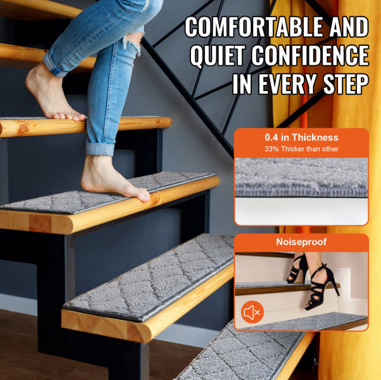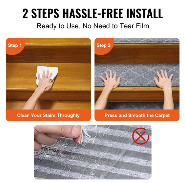 3. 2 Steps Hassle-Free Install: Our stair carpets are incredibly user-friendly. No more sticky glue or bothersome film to deal with. Simply clean your stairs, effortlessly position the treads, and smoothly apply the carpet to each step. It's as simple as that! Experience a hassle-free journey while effectively protecting your stairs.